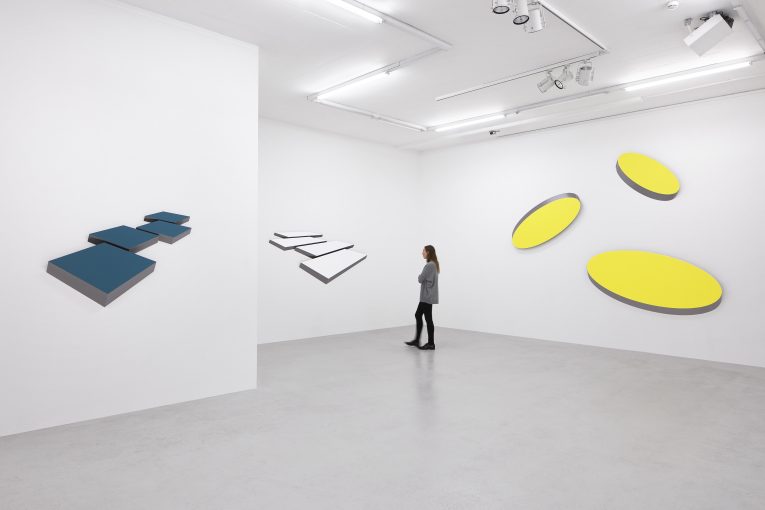 In the first room of the exhibition, the viewer is struck by differently monochrome polygons as well as yellow and red ellipses floating in space, whereby one first believes that one is confronted with abstract images – purely painterly statements. At first glance, these feather-light objects seem to float weightlessly in a virtual space, but on closer inspection they turn out to be heavy steel constructions hanging rigidly on the wall. Already the fictitious lightness of a real weighty material suggests that the recipient, like a trompe l’œil, falls prey to a cleverly generated deception of the senses. In order to get an idea of the power of the works, the viewer must go around the works – the steel reliefs cannot be grasped from a fixed point of view, but change their spatial effect with each step. The object deals with the wall surface surrounded by the individual parts of the work, drawing in the white space in between. The diverging voluminous expansions of the new works also permit a new relationship to the wall, whereby the play of the space in between and its shadows between the various geometric steel bodies is pointed out. An impressive, strongly spatial effect is particularly evident in the large steel reliefs NAGO and ORBIT SOLARIS. The objects shine in bright sun-yellow and blue tones and extend in gigantic size over the side walls of the first gallery room. The precise shapes of the steel surfaces taper off, tilt into the room, seem to say goodbye to weightlessness.
